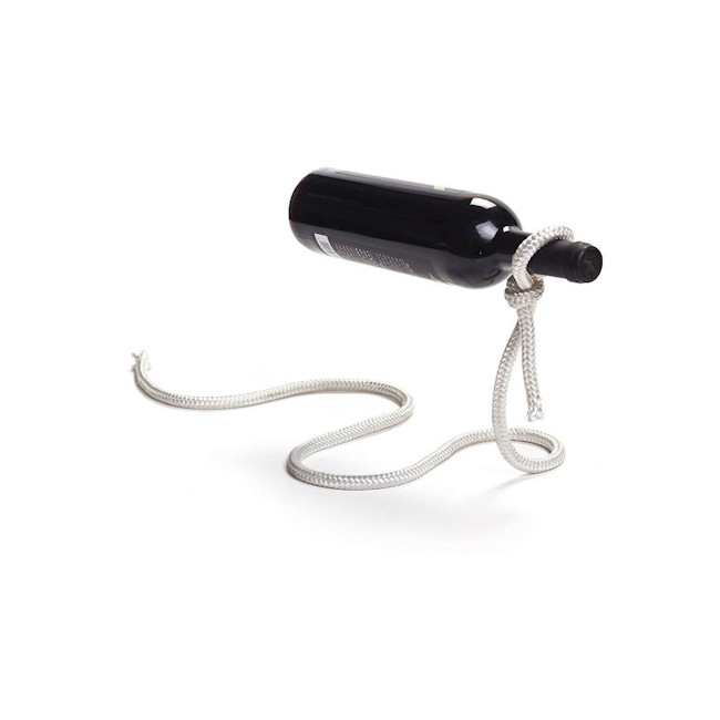 Un porte-bouteille en corde donnant l’illusion que la bouteille flotte en équilibre, un objet magique et décoratif.