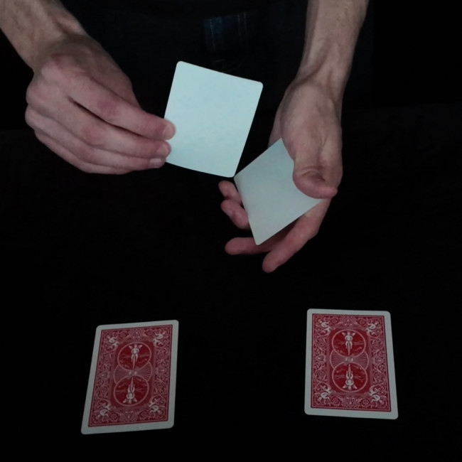 Montrez à votre spectateur 4 cartes blanches, pas encore imprimées… puis transformez-les une à une, à vue, pour révéler un carré !
