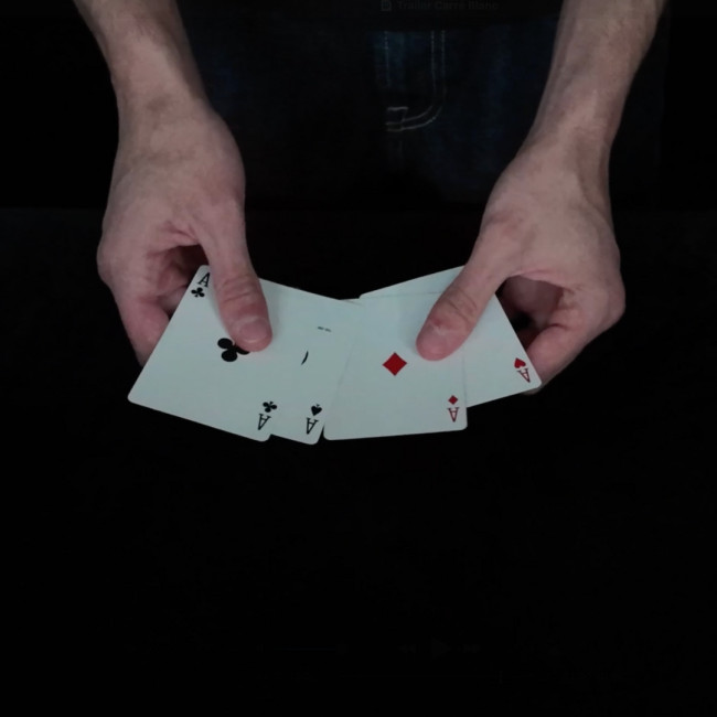 Ce tour de Jean-Pierre Vallarino, remis au goût du jour, vous permet de montrer quatre cartes totalement blanches avant de les faire apparaître une à une sous les yeux du spectateur pour former un carré d’as. L’effet est direct, rapide, visuel, et crée une véritable surprise à chaque transformation.