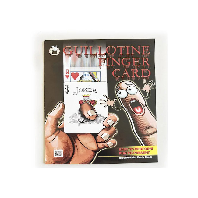 La Guillotine Finger Card est un effet qui impressionne autant qu’il amuse. Trois cartes Bicycle sont montrées, chacune percée en leur centre : deux jokers et une dame de cœur. La dame est placée entre les deux jokers et le spectateur passe un doigt dans les trous. En un instant, la carte descend comme une lame de guillotine et semble traverser le doigt emprisonné !