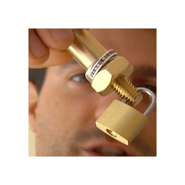Sous un mouchoir, ou même à vue selon la présentation choisie, la bague se libère instantanément ! Elle réapparaît totalement dégagée, tandis que le boulon reste intact avec son écrou bien en place et le cadenas toujours fermé. Aucun échange, aucune manipulation suspecte : le public peut immédiatement examiner tous les éléments.