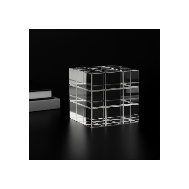 Inspiré du célèbre casse-tête, ce cube transparent évoque à la fois la complexité de la réflexion et la beauté de la simplicité.