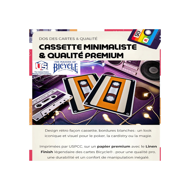 Un jeu de cartes premium inspiré des années 80, design cassette iconique et qualité pro USPCC.