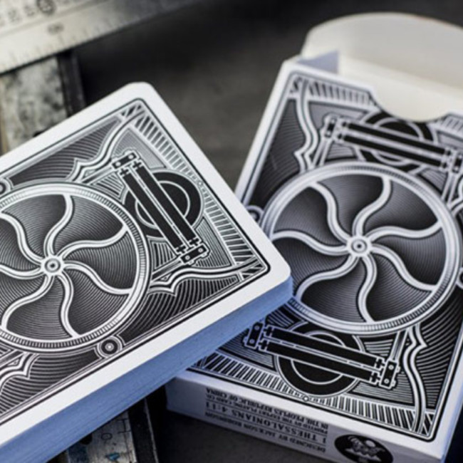 Un jeu de cartes de luxe au design noir et blanc inspiré des machines anciennes avec un style unique et une finition soignée