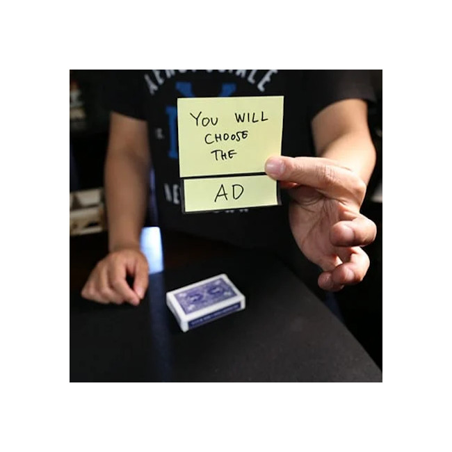 Le magicien décolle le Post-it, le passe lentement au-dessus de la carte… et la magie opère : le message se transforme visiblement. Il lit maintenant « Vous allez choisir le 2 de Trèfle. »