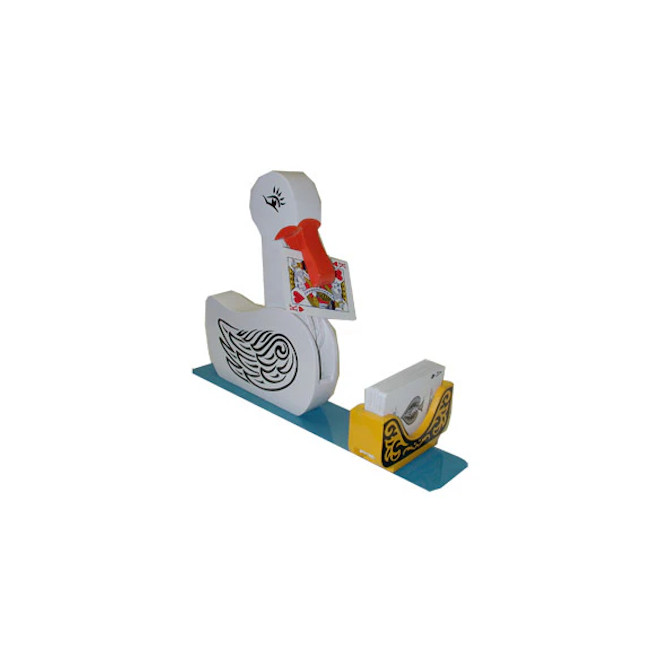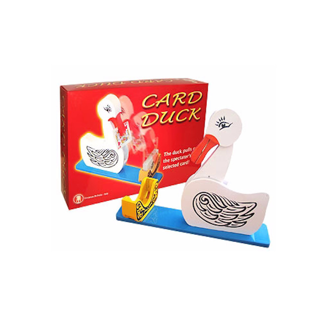 Le Canard à la Carte est un grand classique de la magie qui amuse et surprend aussi bien les enfants que les adultes. Vous faites choisir une carte à un spectateur, elle est remise dans le jeu et mélangée. Vous placez ensuite le jeu dans la petite boîte devant le canard… et le spectacle commence !