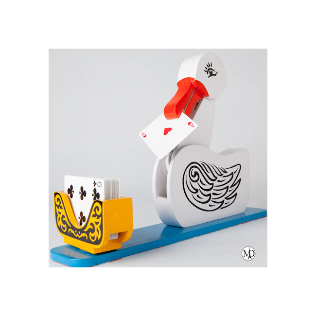 Sous les yeux amusés du public, le canard en bois semble prendre vie : son cou s’allonge, son bec s’ouvre et il attrape une carte dans la boîte. Évidemment, il s’agit de la carte choisie par le spectateur ! Ce moment crée toujours des rires et des applaudissements, car l’effet est à la fois magique et comique.