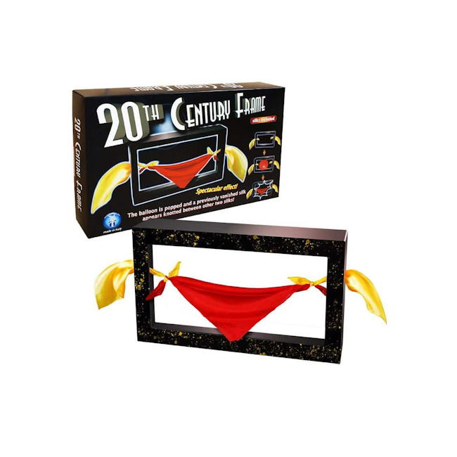 Le 20th Century Frame revisite le célèbre tour des foulards du XXe siècle dans une version scénique, colorée et percutante. Le magicien présente un grand cadre rectangulaire percé de deux orifices. Il y introduit deux foulards de couleur différente, laissant pendre leurs extrémités. Après avoir gonflé un ballon et l’avoir placé au centre du cadre, il fait disparaître un troisième foulard (par la méthode de son choix)…